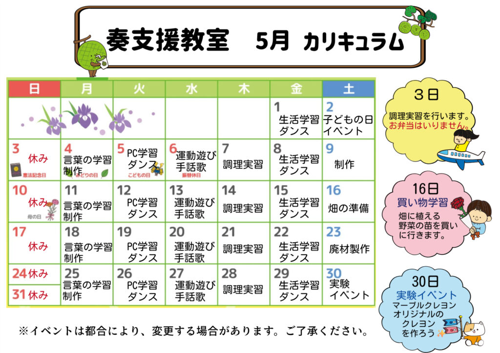 また、祝日や土曜日には、公共交通機関やアスレチック公園に出かけたり積極的な外出支援を行っています。たくさんの社会的資源に触れることで公共施設等でのマナーを育み地域社会との交流を図っています。