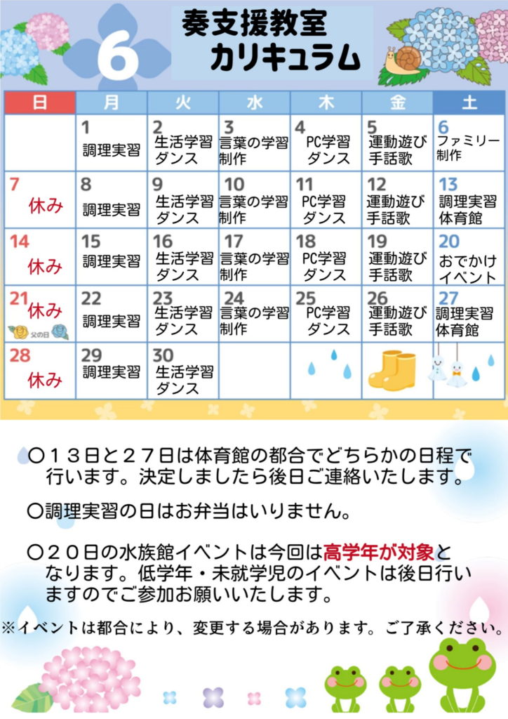 また調理実習カリキュラムの日には自分たちでおやつを作り調理の手順や道具の使い方を学びます。おやつ後には、後片付けや掃除なども分担して行い生きる為に必要なライフスキルの向上を図ります。